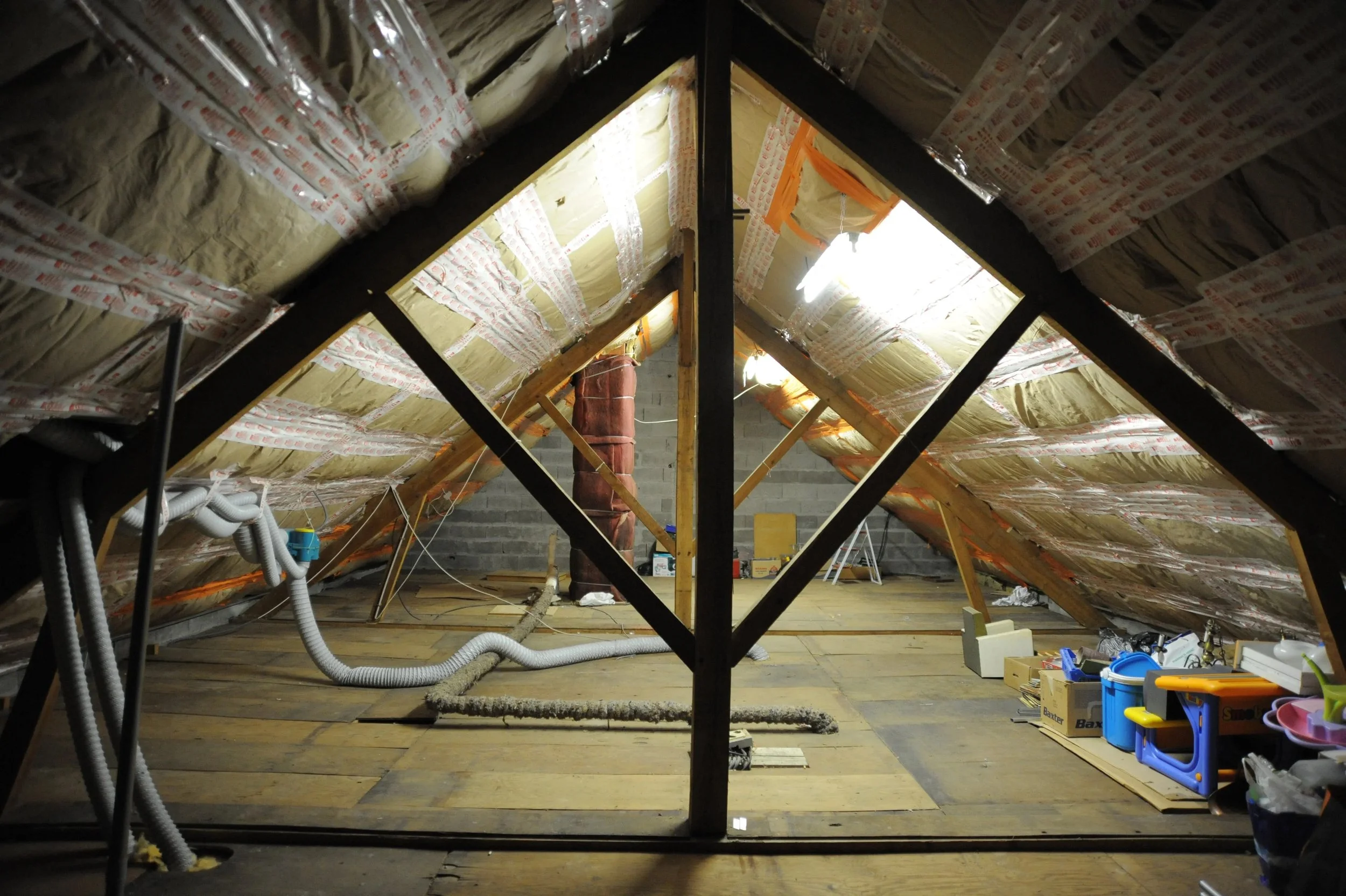 Isolation par l'intérieur de la toiture en appliquant une isolation entre les poutres. Une fois recouverte de plaques de plâtre, la surface des combles est aménageable ou utilisable à des fins de stockage