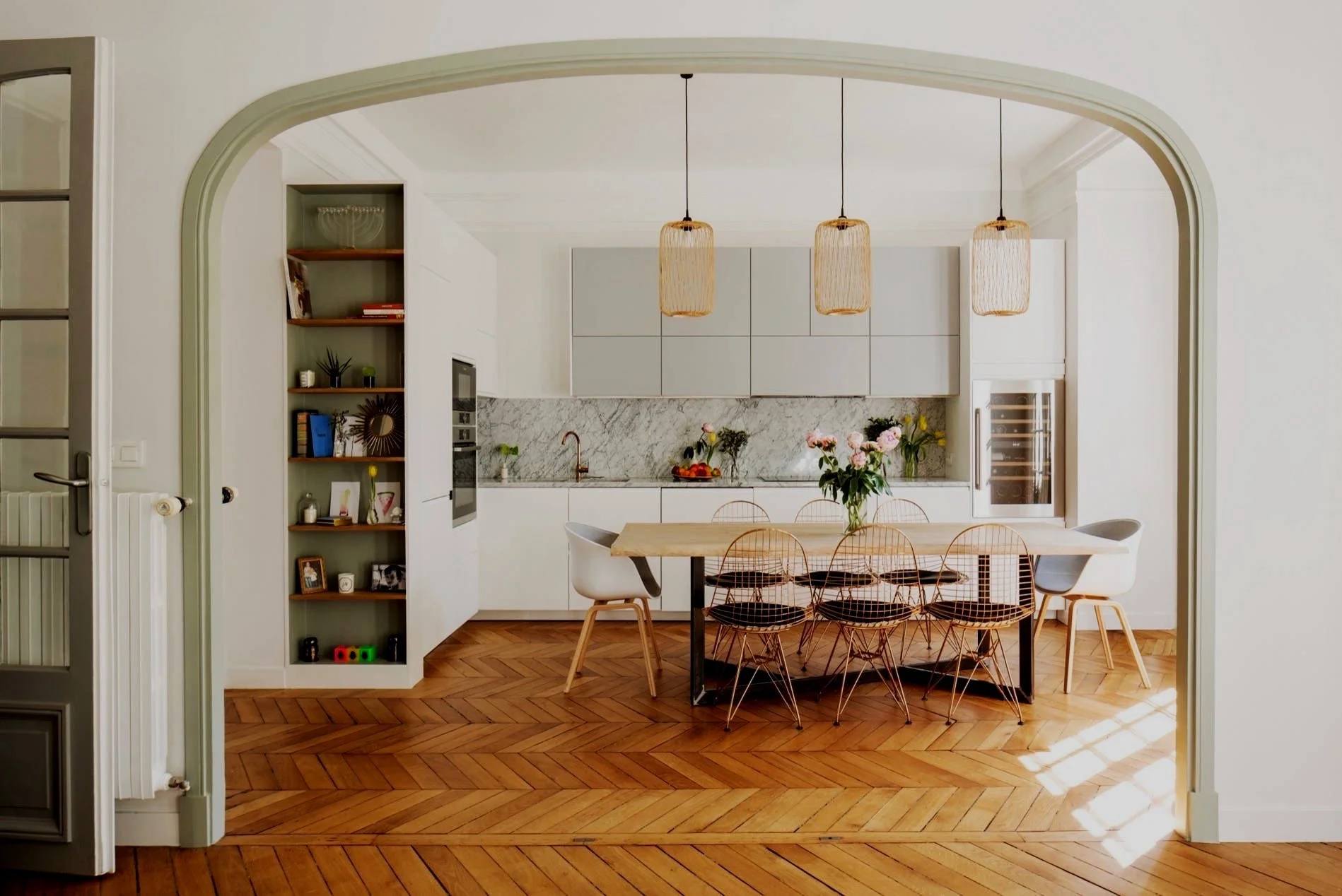 Parquet stratifié : la couche supérieure n'est pas en bois, mais est imprimée et protégée par une résine. Il est conçu pour une pose "flottante", s'entretient comme un revêtement synthétique et ne se rénove pas.